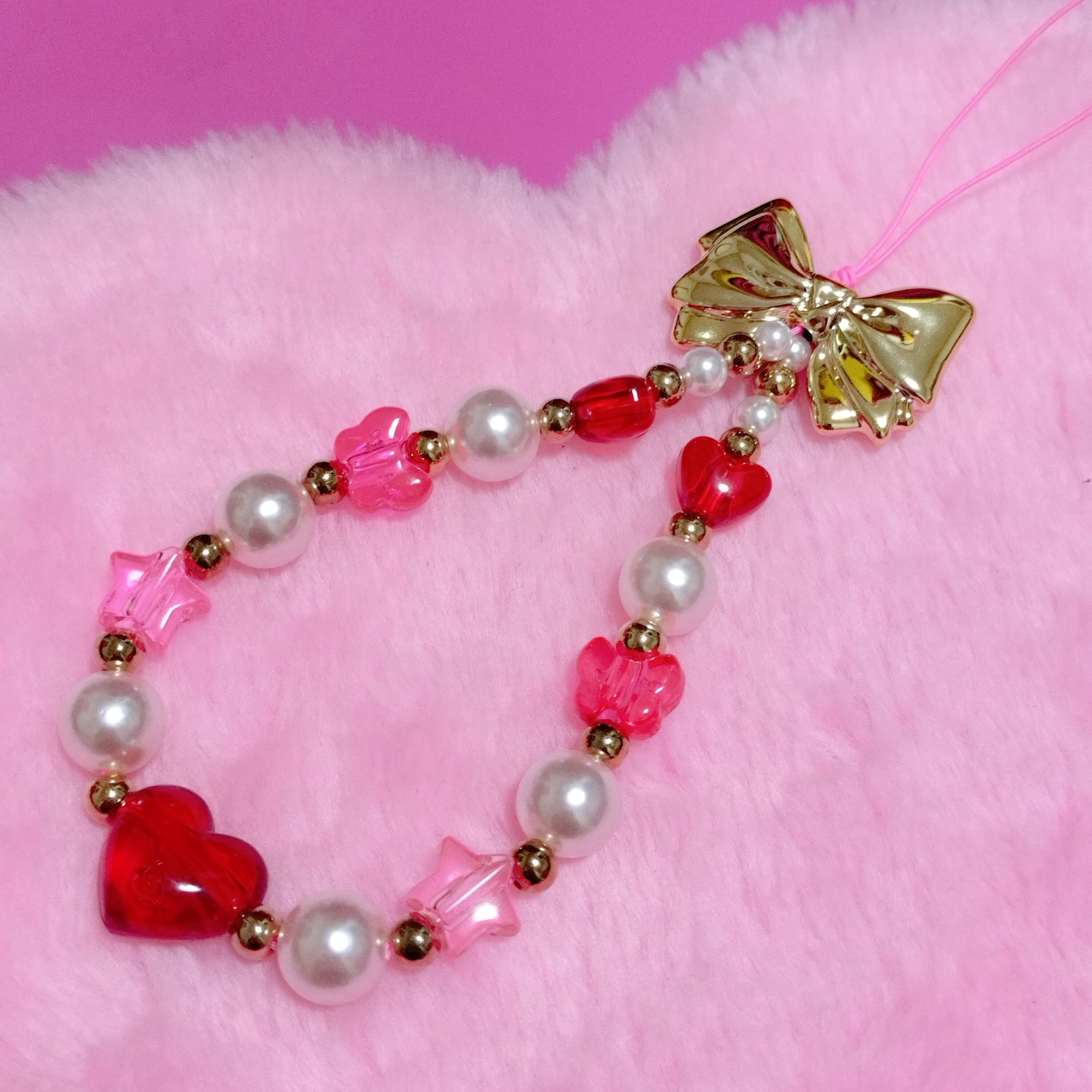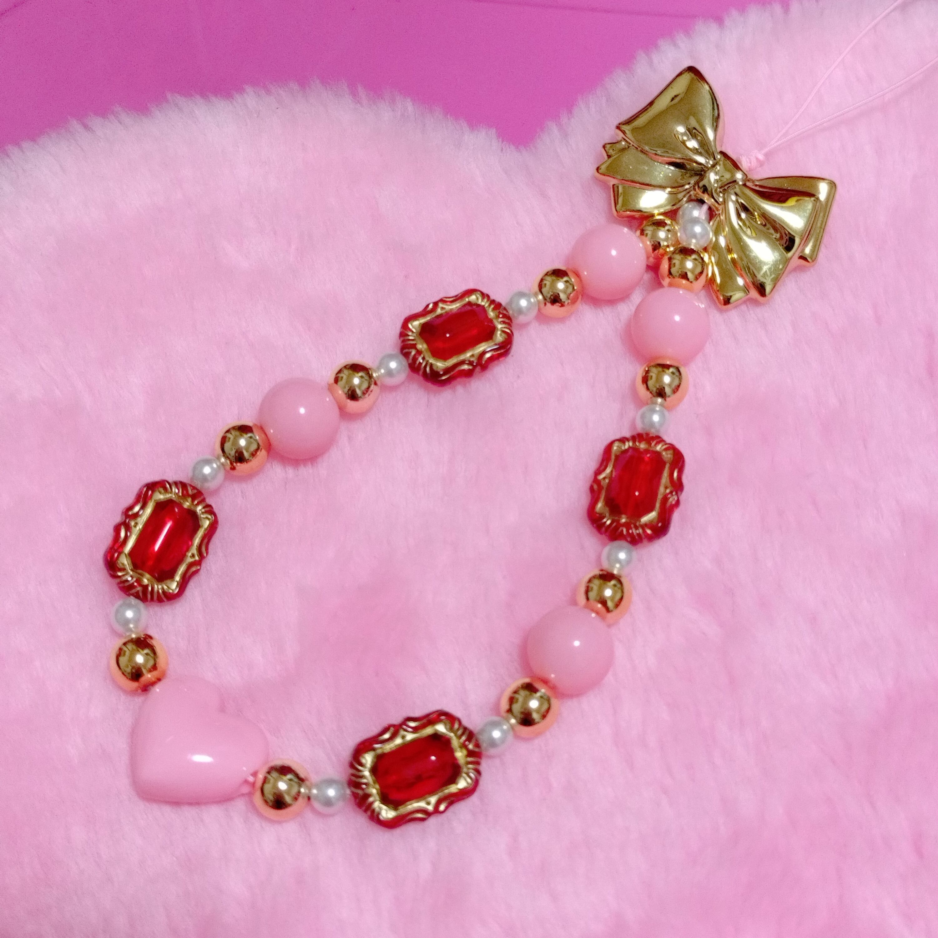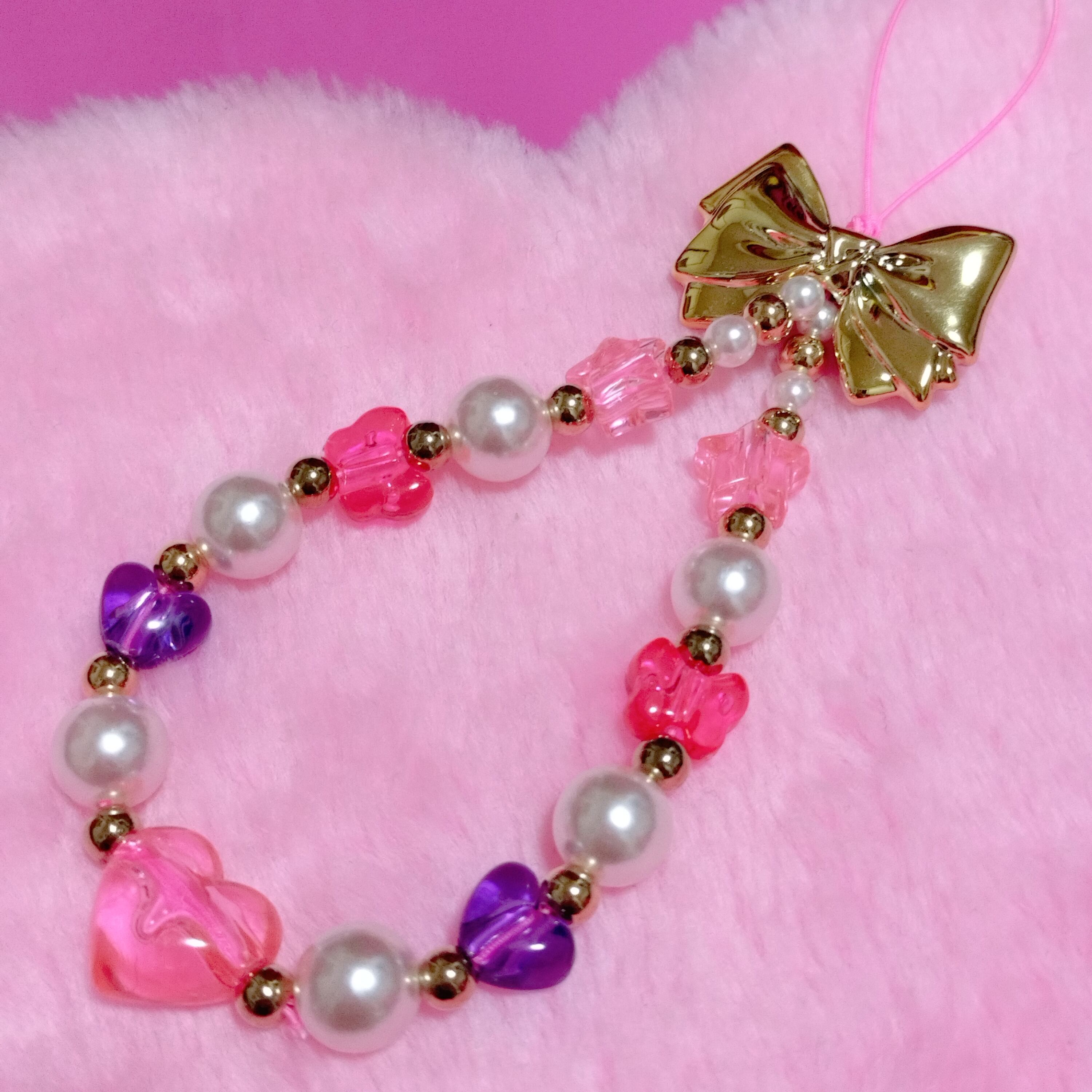 おおきなゴールドメッキのリボンビーズが目を引く、Y2Kスタイルのビーズストラップ。