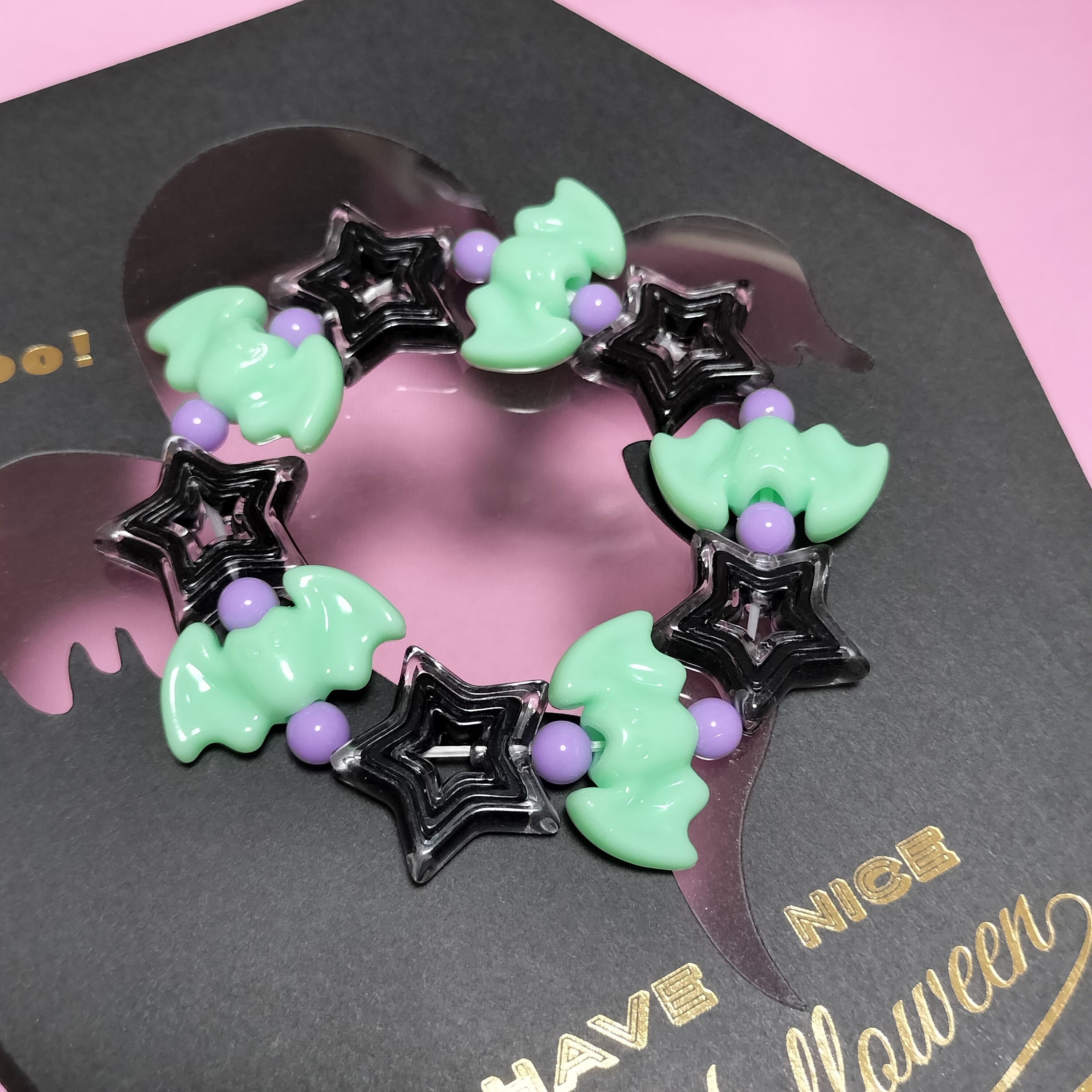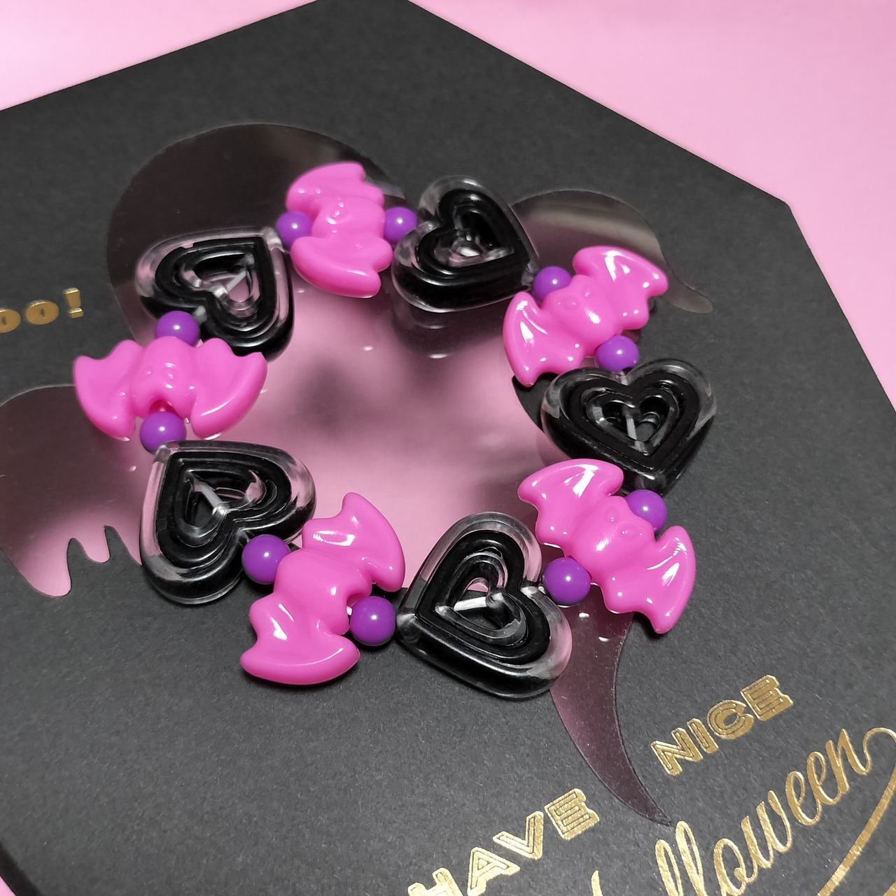 闇夜をコウモリが舞うブレスレットは、王道カラーの紫×ピンク&ちょっとめずらしいパステルグリーン×パープルの2色をご用意♢