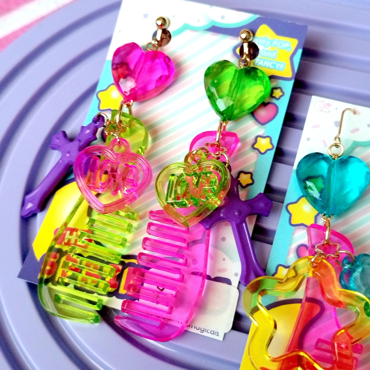 クリア素材でネオンなカラフルさを表現して、パーティーフロアのような賑やかでHAPPYなイヤリングに仕上げました☆