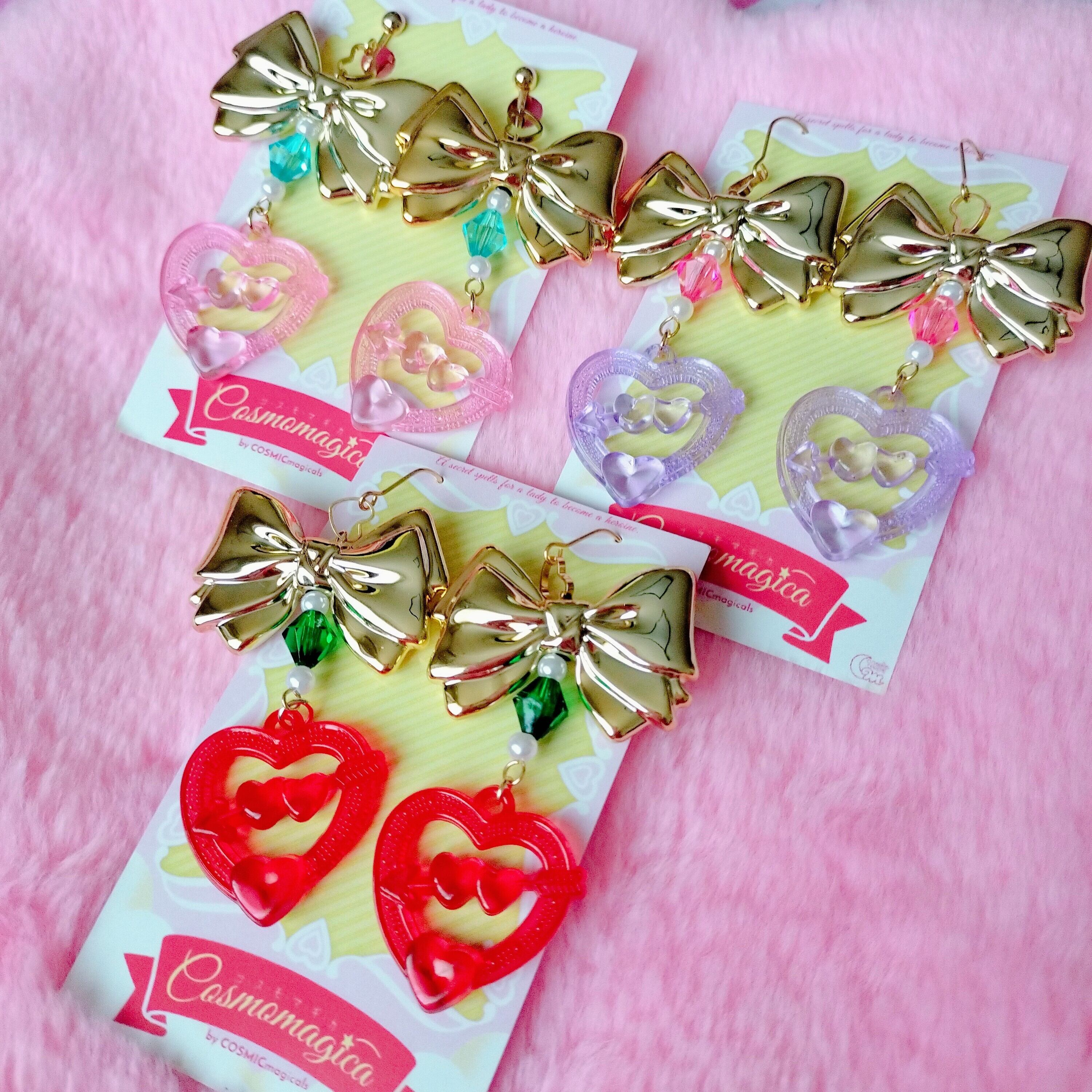 キッチュなプラスチックハートを金色のリボンで結んだ、ゆらゆら揺れる大ぶりなイヤリング。