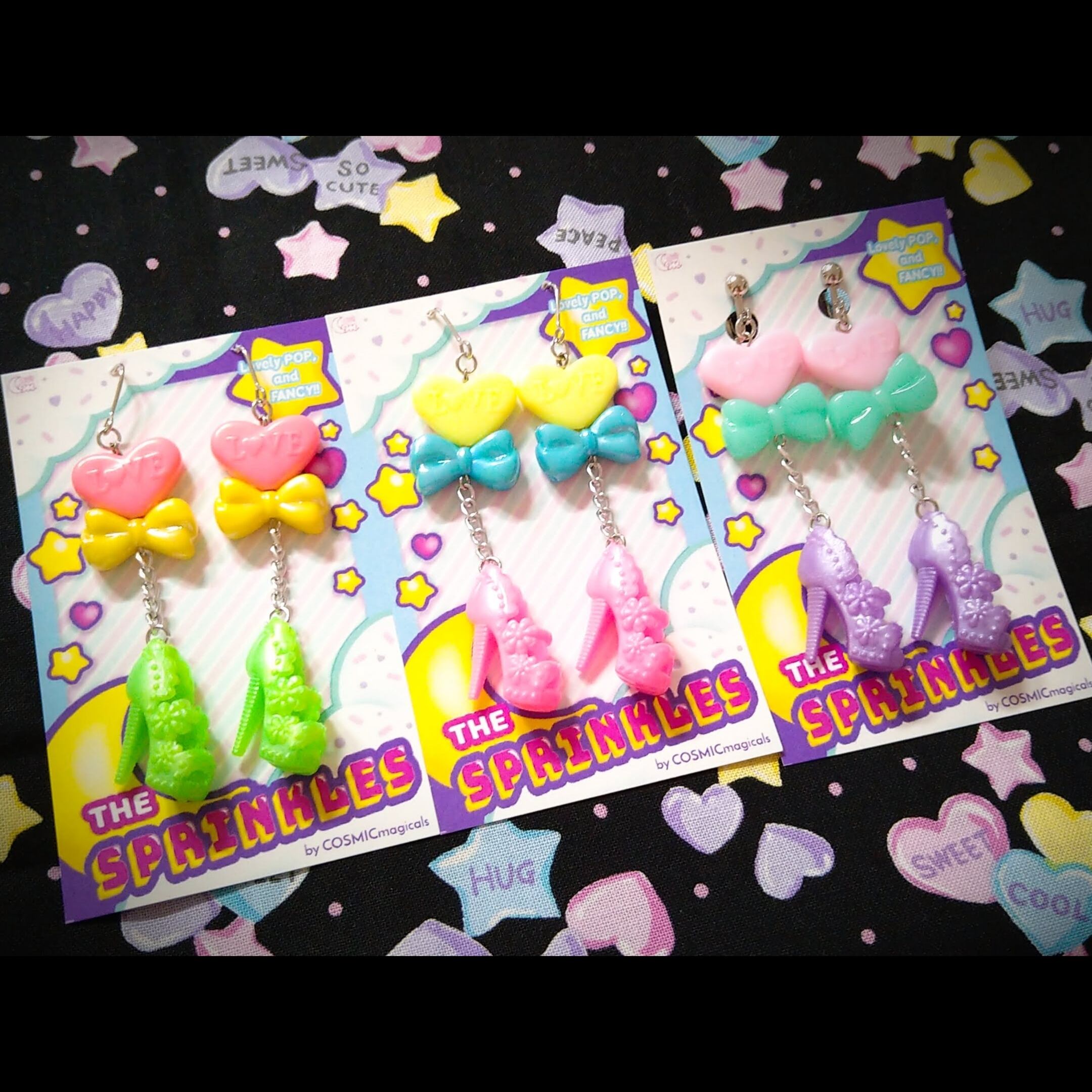 リボンを結んだハートのバルーンにユニークなハイヒールが耳元で揺れる、ロングタイプのイヤリングです♡