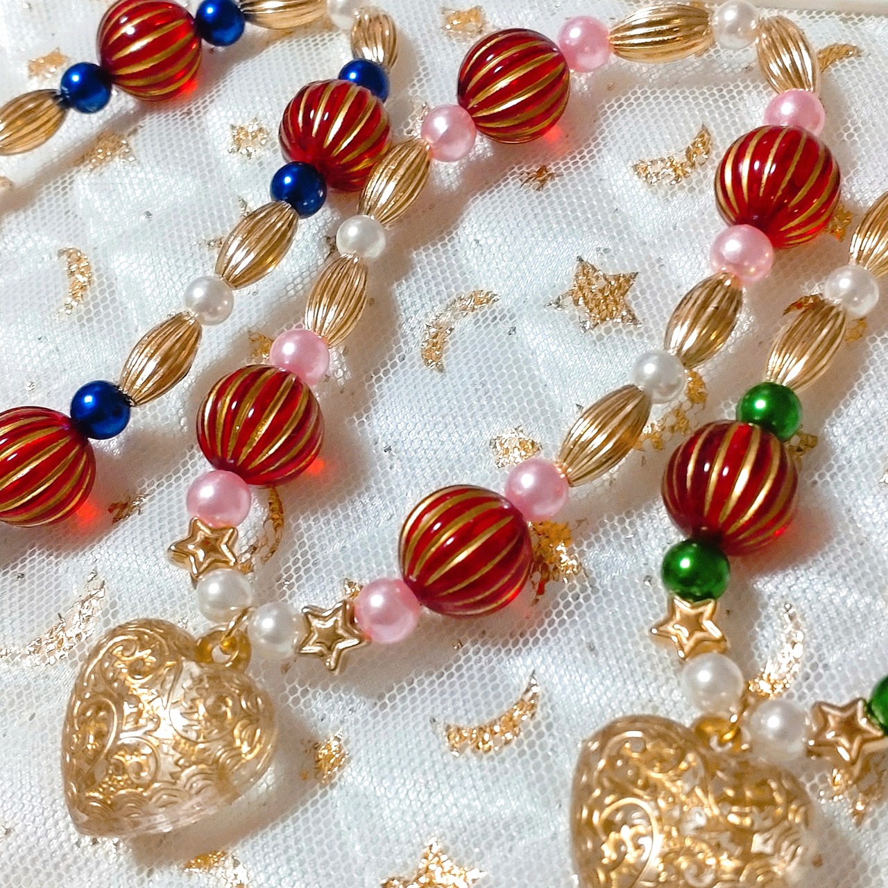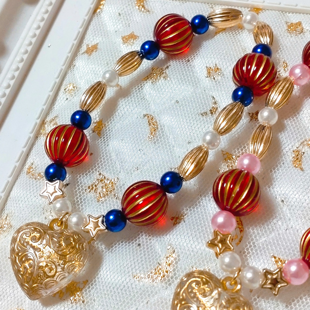 落ち着いたトーンの赤色ビーズに小粒のカラーパールを合わせ、ゴールドで纏めたブレスレット♡